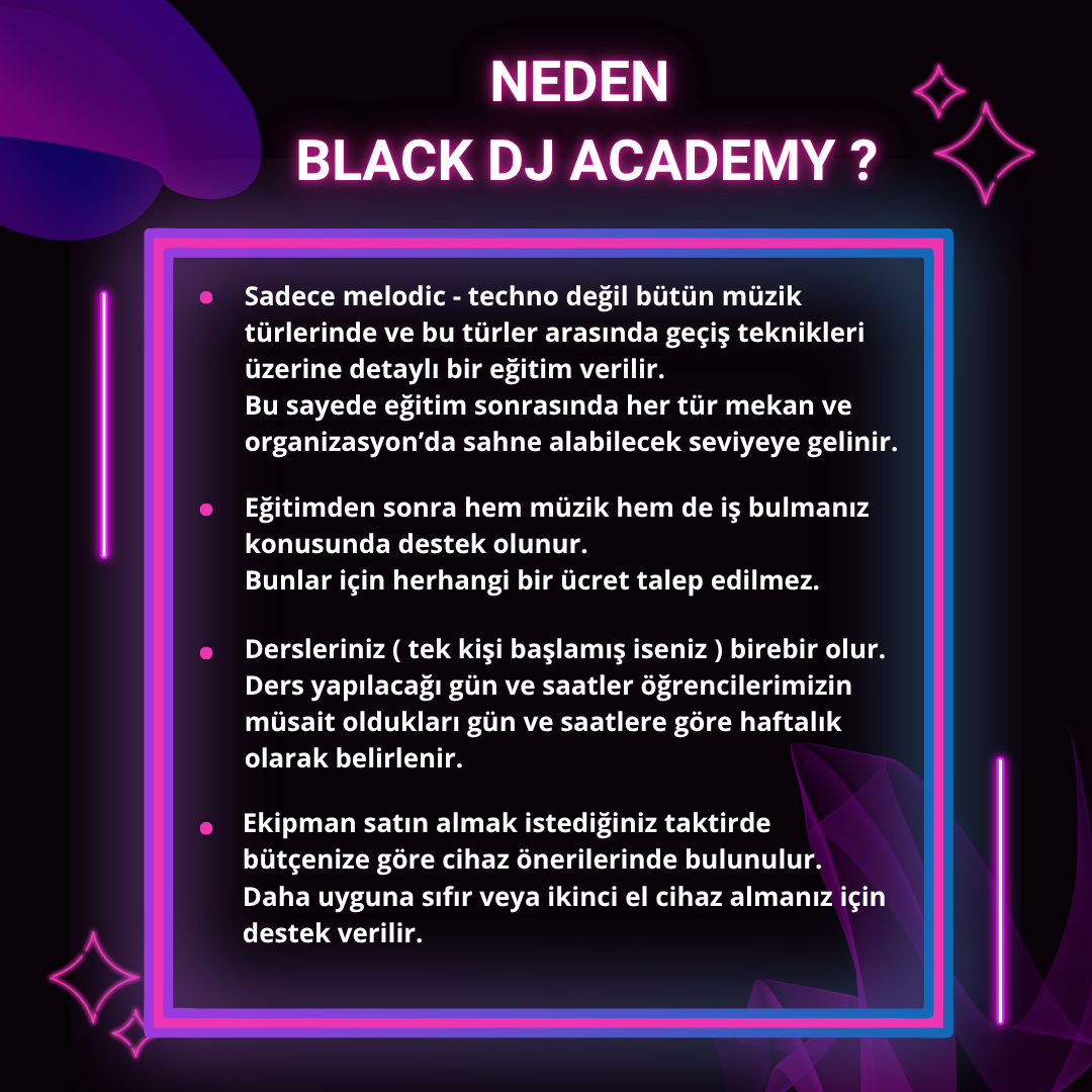 Black Dj Academy olarak vizyonumuz, ticari bir kuruluş olmaktan ziyade öğrencilerimizi sektöre kazandırmaktır. Bu amaç doğrultusunda hem eğitim sürecinde, hem de sonrasında ücretsiz olarak destek vermeye devam ediyoruz.
